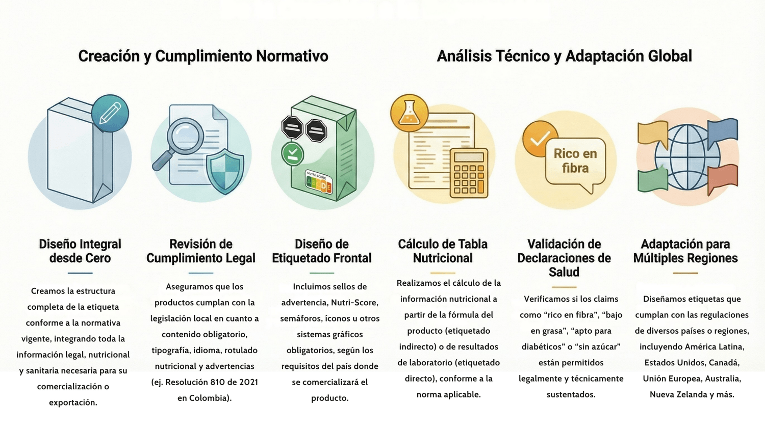 Dominamos la legislación de etiquetado de América Latina, Estados Unidos, Canadá, la Unión Europea, Australia, Nueva Zelanda y otros mercados globales.
