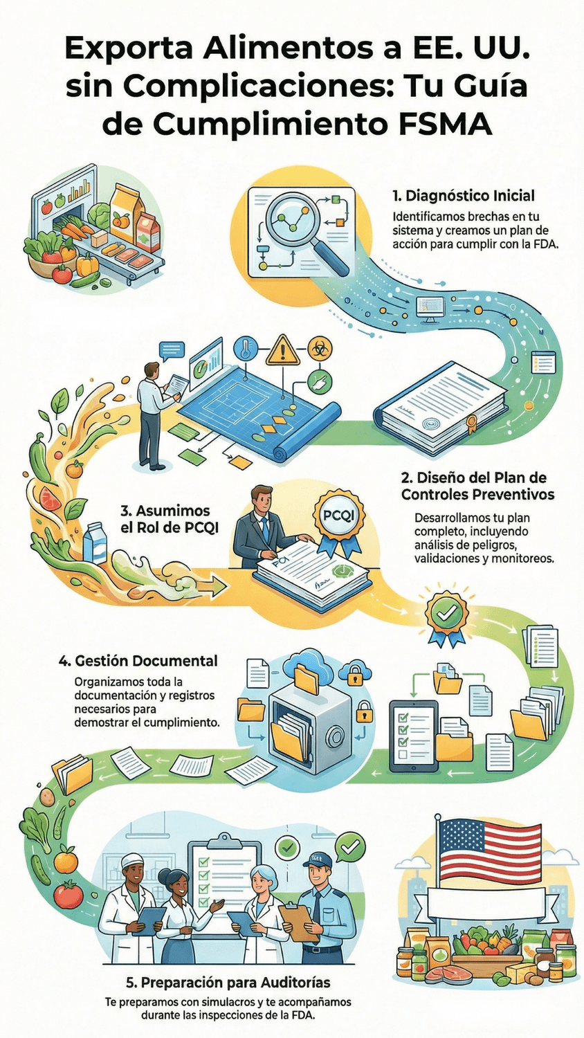 La Ley de Modernización de la Inocuidad Alimentaria (FSMA), emitida por la Administración de Alimentos y Medicamentos de Estados Unidos (FDA), es de cumplimiento obligatorio para todas las empresas que exportan alimentos, bebidas o ingredientes a ese país.