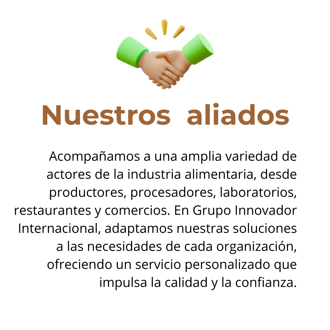 Somos Grupo Innovador Internacional, una organización colombiana. Tenemos más de 15 años de trayectoria dedicados a fortalecer la salud pública a través de la ingeniería de alimentos, la inocuidad y los sistemas de gestión de calidad. Nacimos como una iniciativa de asesorías para pequeñas empresas y hoy contamos con servicios a nivel nacional y en diferentes lugares del mundo, logrando acompañar a más de 100 compañías del sector alimentario. Somos un referente en asesorías, capacitaciones, auditorías y servicios regulatorios, contribuyendo al desarrollo sostenible y seguro de las empresas de alimentos.